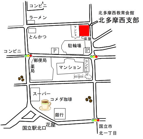 ・電車で・・・「JR国立駅」北口を出て、すぐ右折し、最初の交差 点で左折して直進してください。 ( 駅からの所要時間 = 徒歩約6分 )